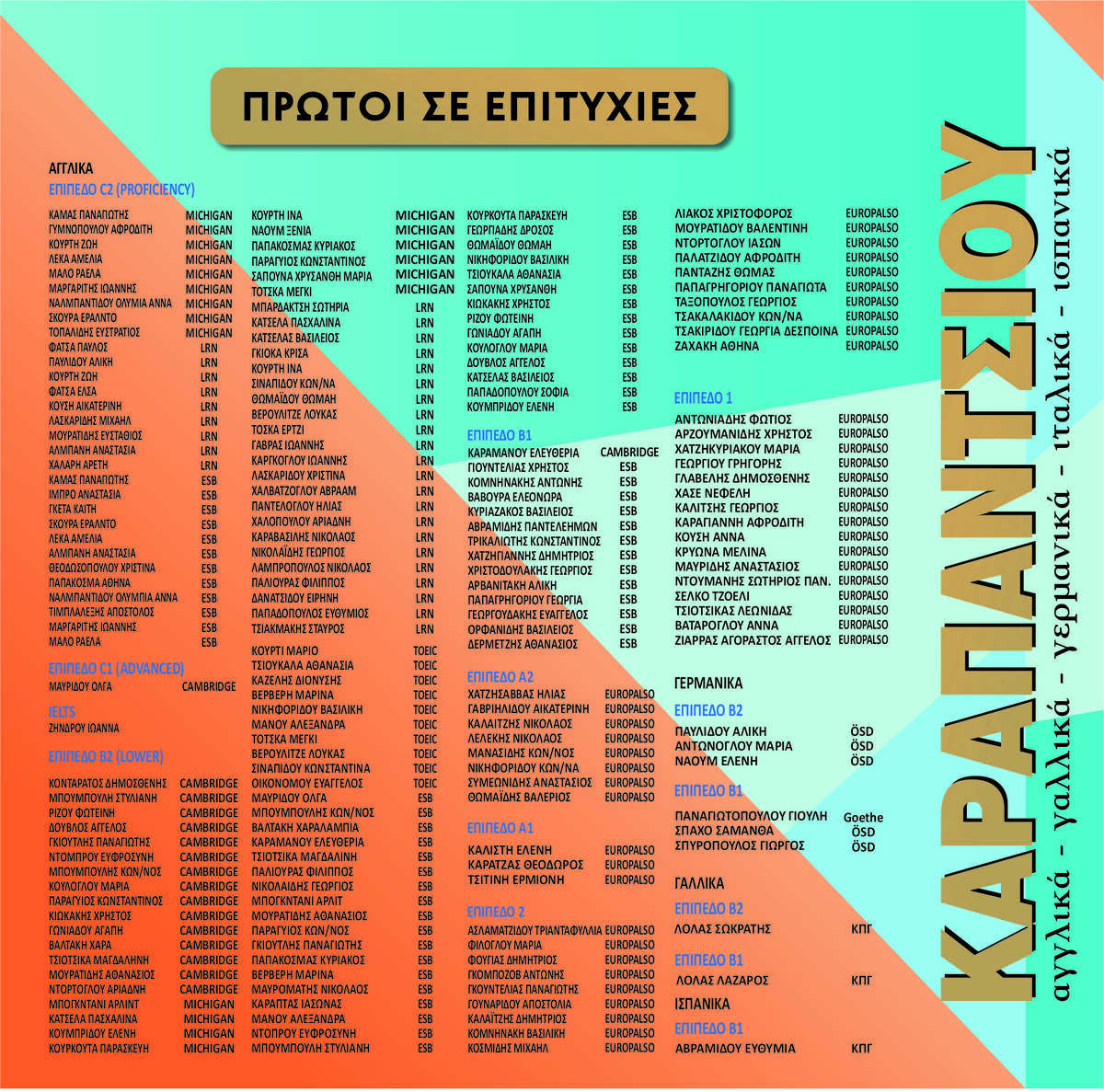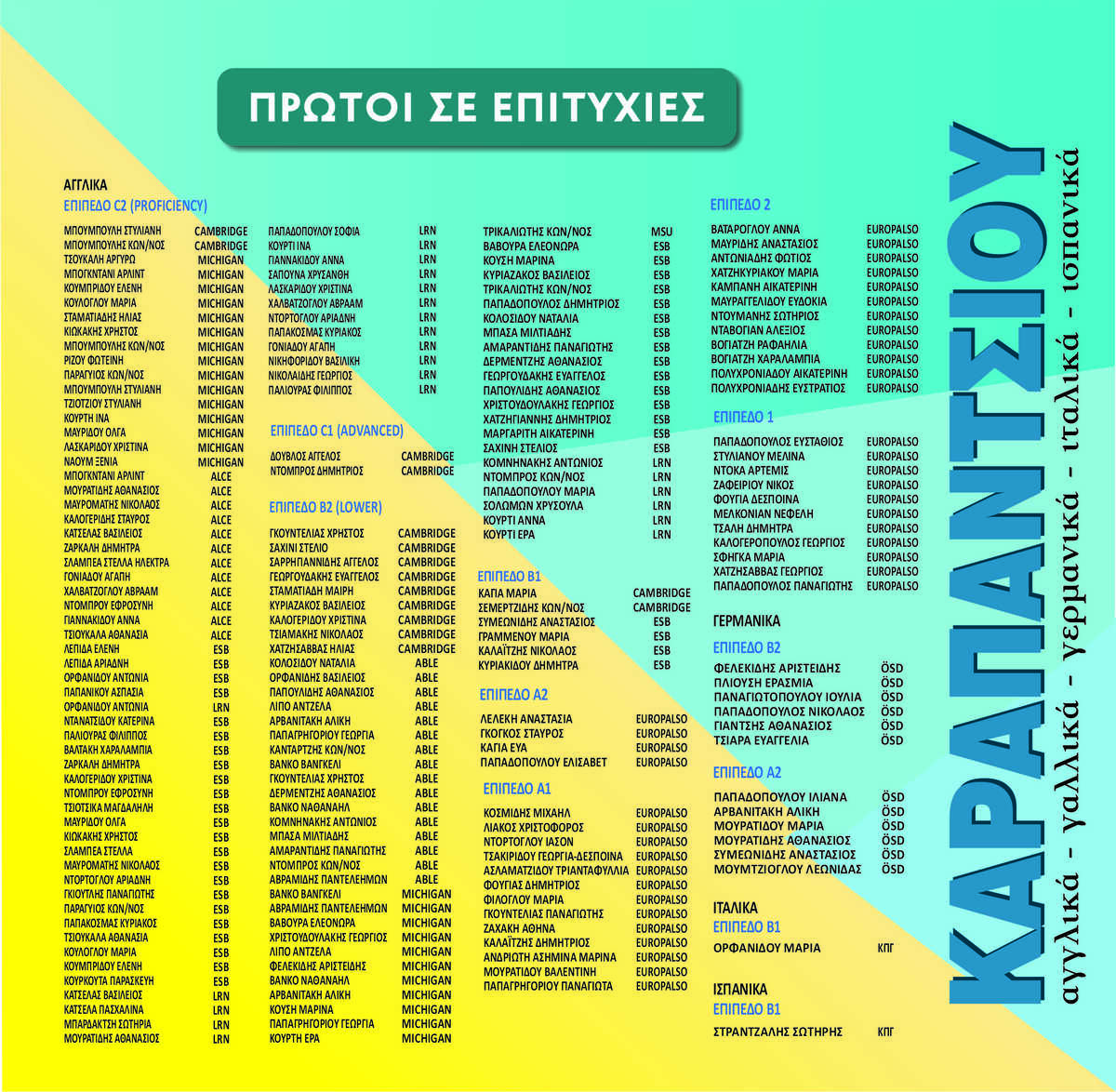 Ο Εκπαιδευτικός οργανισμός Καραπάντσιου παραμένει σταθερά στην κορυφή πρώτος σε επιτυχίες με ποσοστό που αγγίζει το απόλυτο 100% σε όλα τα επίπεδα, δημοσιεύοντας κάθε χρόνο τα ονόματα των πτυχιούχων . Και συνεχίζουμε ...